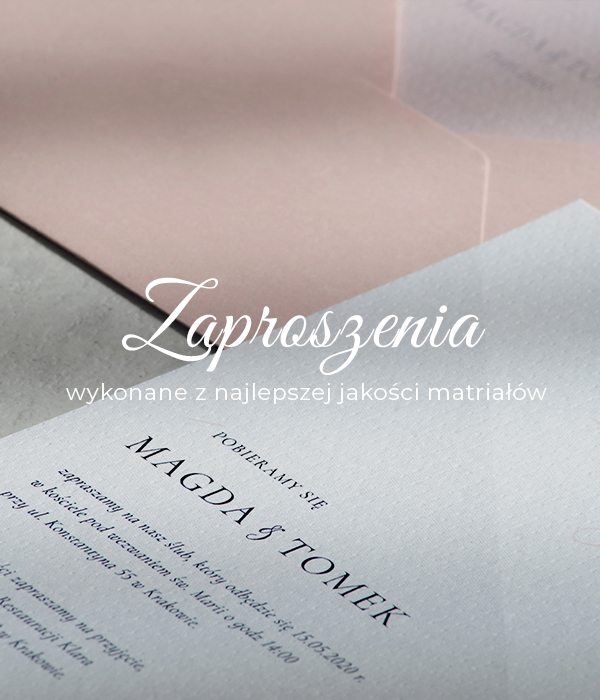 Ślub jest to wyjątkowa okazja wymagająca niezwykłej staranności w wyborze oryginalnych wzorów i form. Projektując zaproszenia staram się szukać pomysłów dla każdego – dla Pary Młodej ceniącej tradycję i elegancję, kochającej naturę, jak i również zbuntowanych zakochanych mających zupełnie inny pomysł na swoje wesele. W mojej ofercie znajdziecie wiele ciekawych i odważnych pomysłów. Staram się uciekać od popularnych rozwiązań i tworzyć autorskie wzory, które zachwycą Waszych gości. Wszystkie zaproszenia i dodatki ślubne przygotowuję ręcznie, dokładając wszelkich starań na każdym etapie ich tworzenia – od projektu aż po wydruk.